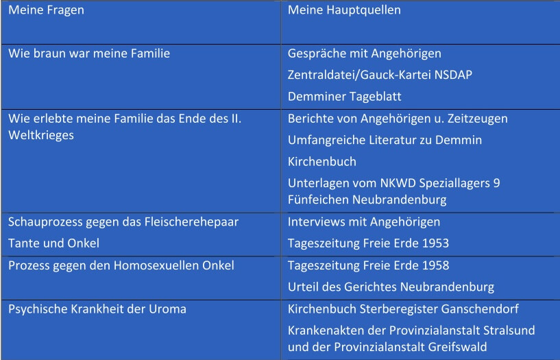 Durch Recherchen in der Zentralkartei der NSDAP, die im Bundesarchiv in Berlin-Lichterfelde lagert, konnte Frau Hofmann herausfinden, dass ein Großteil ihrer Familie Mitglieder der NSDAP war, passiv, aber nicht aktiv das NS-Regime unterstützte. Fast jedes Mitglied des Demminer Familie musste ein schlimmes Schicksal ertragen: Gefallen an der Front, Gefangenenlager, Vergewaltigungen, Plünderungen, Verluste aller Art. Die Familie erlebte Ende April/Anfang Mai die Katastrophe von Demmin. Die Stadt wurde auf Befehl der Sowjetarmee gebrandschatzt, Frauen vergewaltigt, Männer in das Speziallager Nr. 9 Fünfeichen des NKWD interniert.